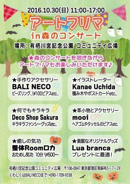 10月30日(日)*今週末です* 森のコンサート&コミュニティカフェ 11:00~17:00 有栖川宮記念公園(港区麻布5-27-9) 日比谷線広尾駅より徒歩3分 雨天中止 アートフリマコーナー「癒しの気功」整体Roomロカにて お待ちしてます^^! 公園が広いので、お子様連れでもお楽しみいただけます! |
