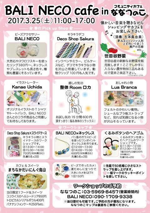 2017.3.25(土)11:00~17:00 BARI NEKO cafeにて*お試し気功整体:15分600円*でお待ちしております! ワークショップもあるのでアクセサリーや小物好きな方、ぜひお越しください!! フード&スイーツも充実@@世田谷野菜も買えますよ! もちろん整体Roomロカでリラックスされていって下さいませ** |
